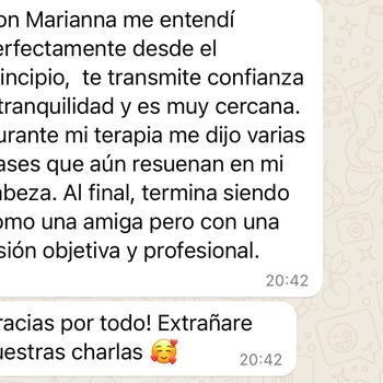 Hola! Vuelvo a utilizar esta app después de tiempo. Soy Marianna, psicóloga general sanitaria, neuropsicóloga y terapeuta EMDR. Estoy especializada en trauma y ofrezco terapia presencial en Barcelona, así como sesiones online en castellano e italiano. Trabajo desde un enfoque cercano, respetuoso y humano. Integro diferentes enfoques terapéuticos basados en la evidencia, como la terapia cognitivo-conductual, el EMDR y el mindfulness. Mi objetivo es ayudarte a comprender tu historia, identificar qué experiencias te han marcado y te han llevado a ser quien eres hoy, para que puedas recuperar el equilibrio emocional y construir una vida más conectada contigo misma. Puedes encontrarme en Google y en Doctoralia. Contáctame para más información o para agendar una primera sesión.