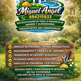 MIGUEL ÁNGEL – SERVICIOS DE LIMPIEZA Y MANTENIMIENTO Limpieza de hogares Limpieza y mantenimiento de jardines Mantenimiento de piscinas Arreglo de persianas Instalación de electrodomésticos Mudanzas Limpieza de enseres Presupuesto sin compromiso Miguel Ángel